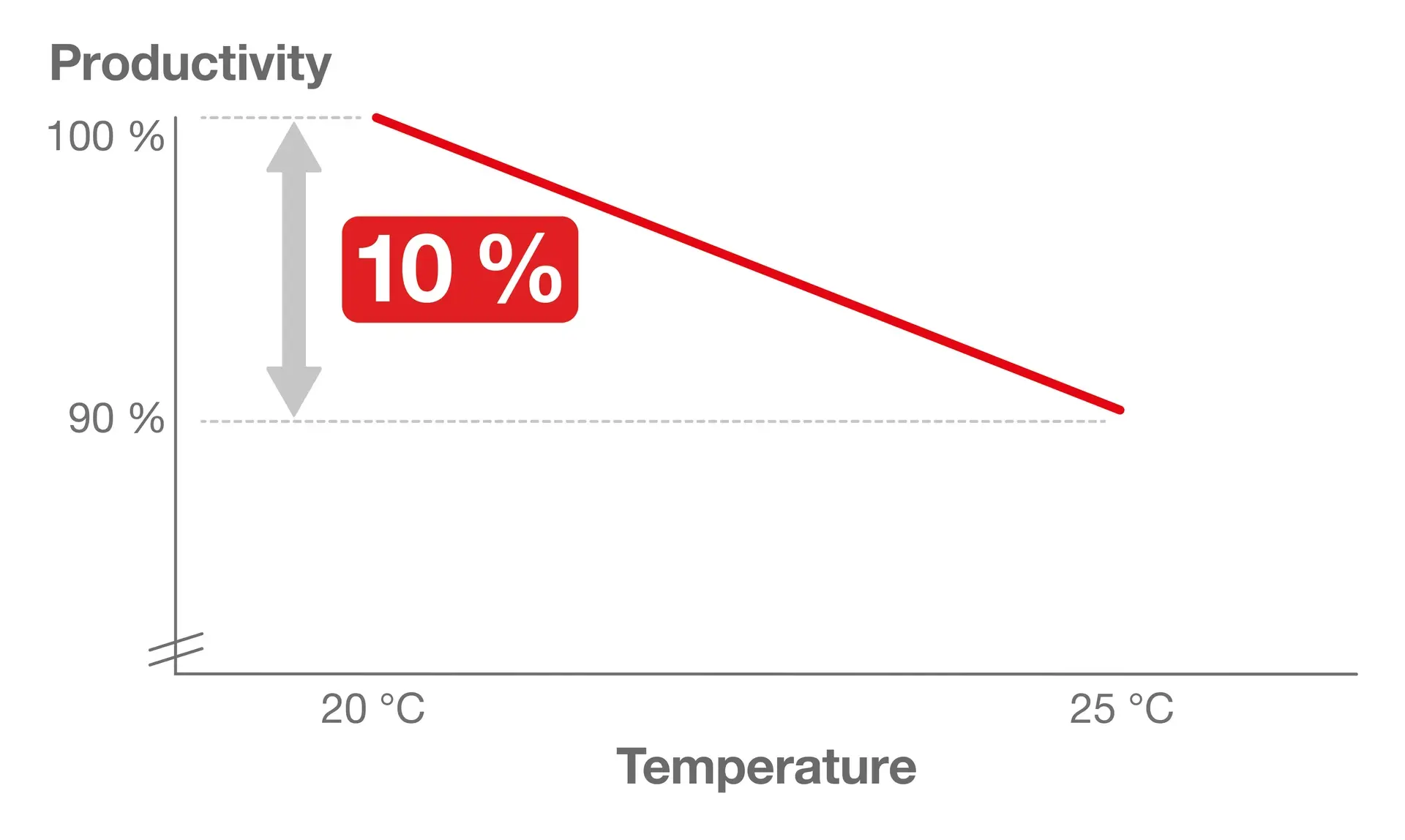 An example from an assembly industry where the ambient environment is cooled and heated using air shows that productivity decreases by at least 10% if the temperature is 25°C instead of 20°C.