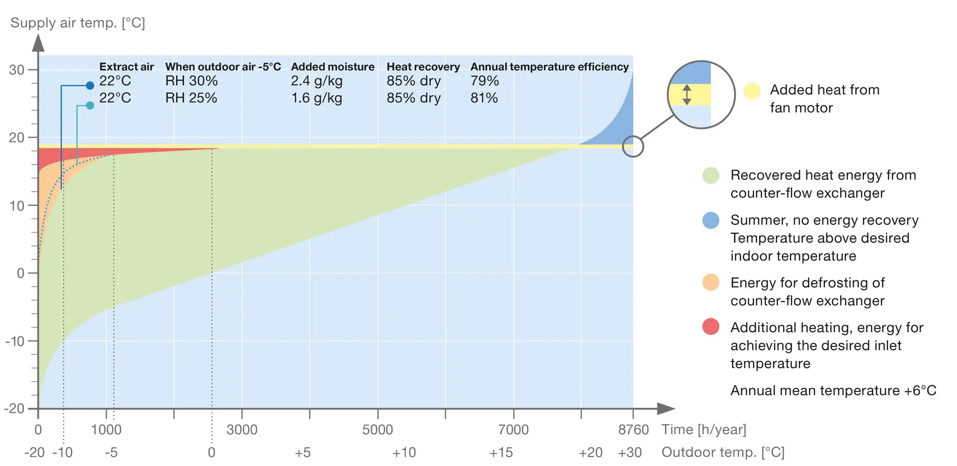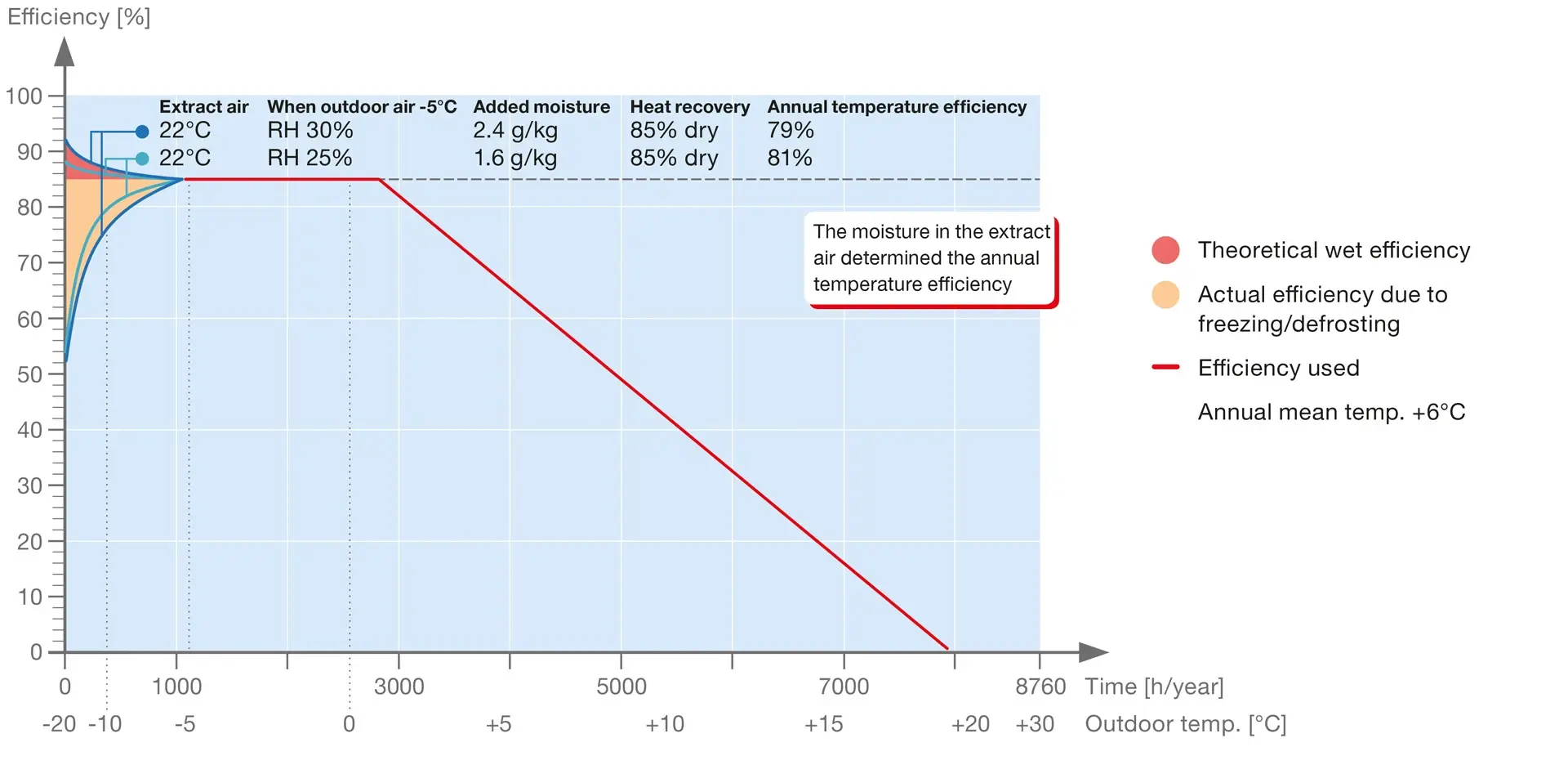 A dry temperature efficiency of 85 per cent is equivalent to a wet temperature efficiency of over 90 per cent. The wet temperature efficiency is theoretical and may not work in practice due to freezing. We have tried to illustrate this in the diagram below.